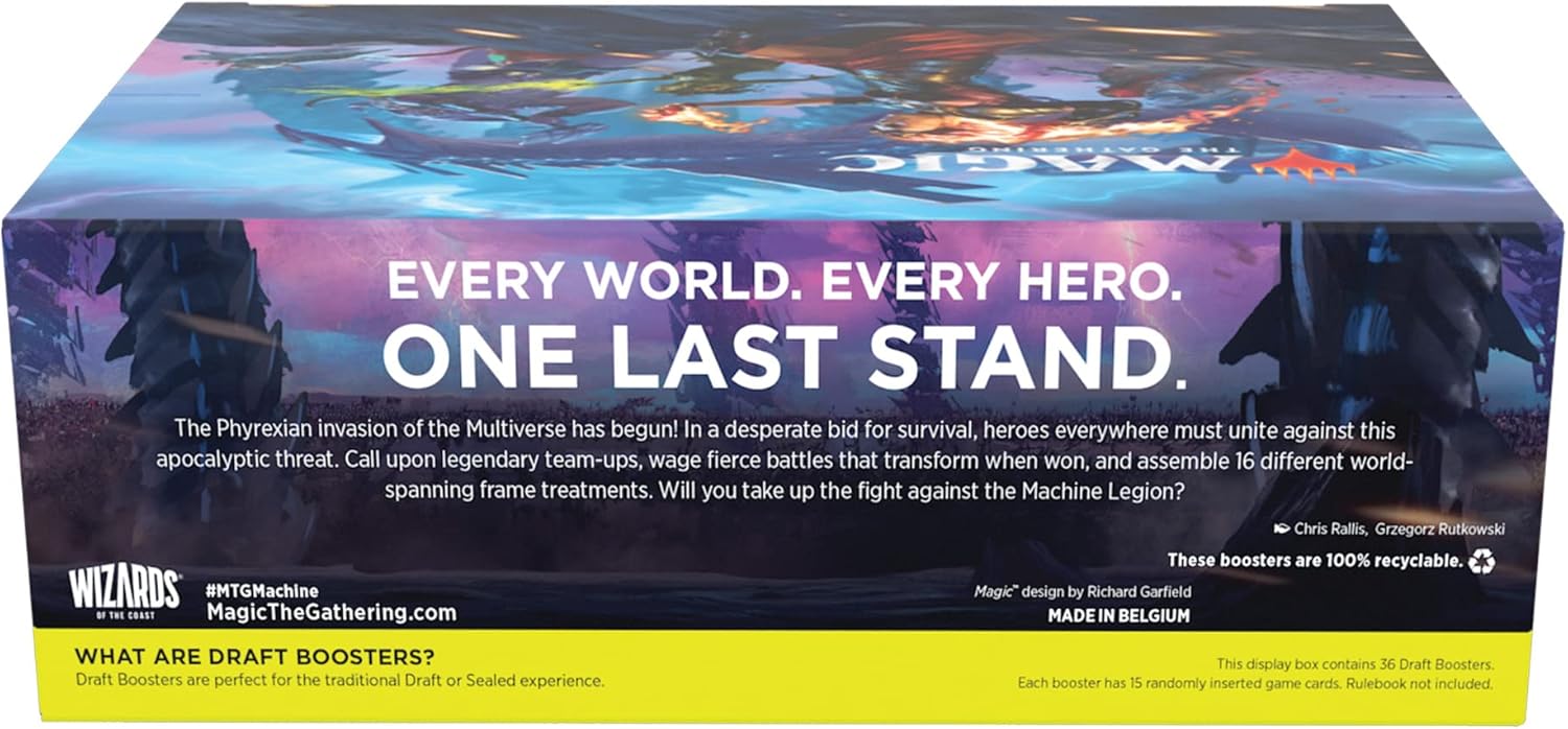 The March of the Machine Draft Booster Box contains 36 March of the Machine Draft Boosters. Each Draft Booster contains 15 cards and 1 token/ad card or Helper card, including 1–2 card(s) of rarity Rare or higher and 3–5 Uncommon, 8–9 Common, and 1 Land cards. Traditional Foil Borderless Mythic Planeswalker in <1% of boosters. Traditional Foil of any rarity replaces a Common in 33% of boosters.