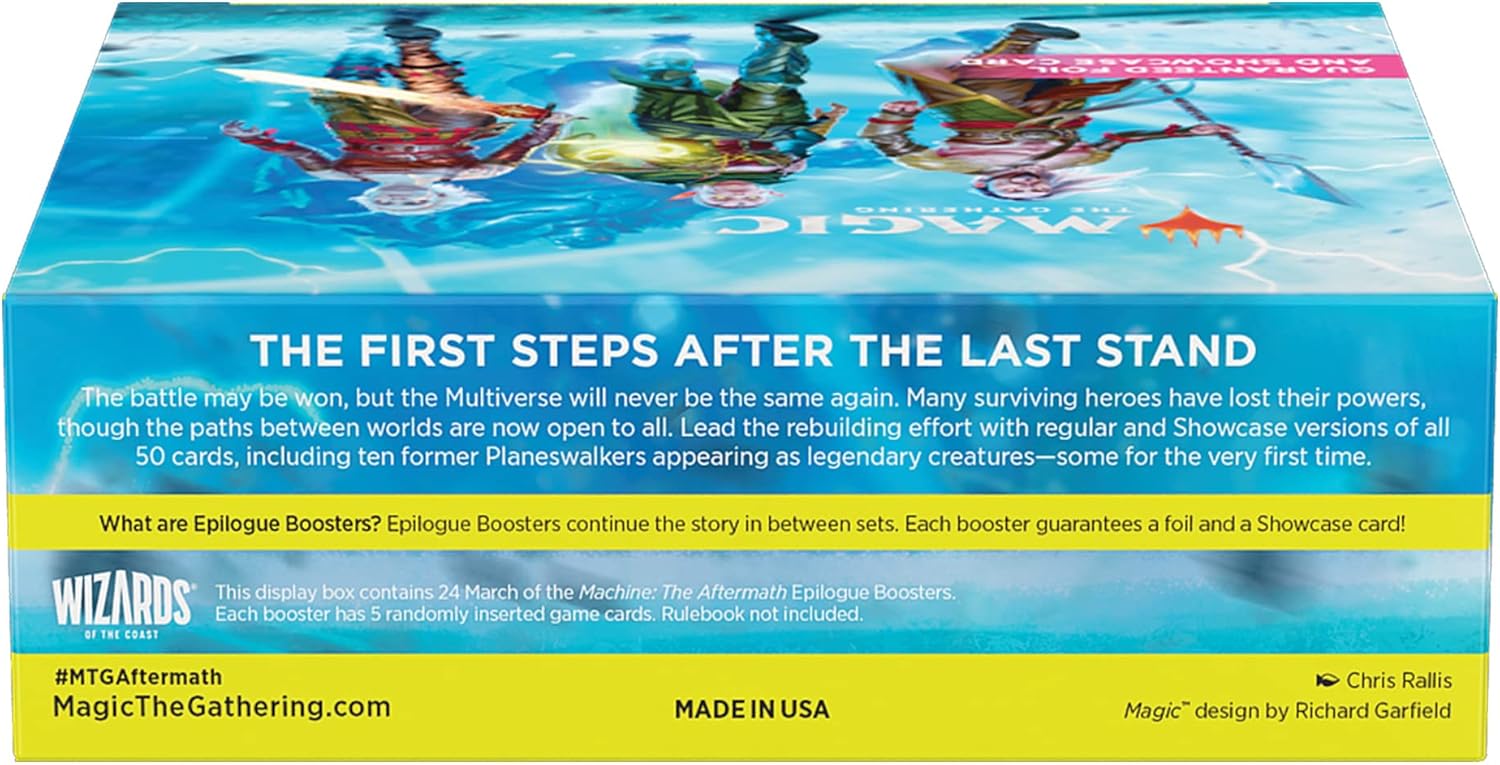 Epilogue Boosters continue the story in between sets. Each lore-packed booster guarantees a foil and a Showcase card! The March of the Machine: The Aftermath Epilogue Booster Box contains 24 March of the Machine: The Aftermath Epilogue Boosters. Each Epilogue Booster contains 5 cards, with a combination of 1–3 card(s) of rarity Rare or higher and 2–4 Uncommon cards. In every pack, a total of 1–2 card(s) of any rarity are Traditional Foil.